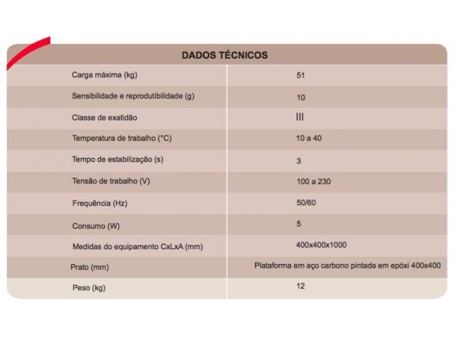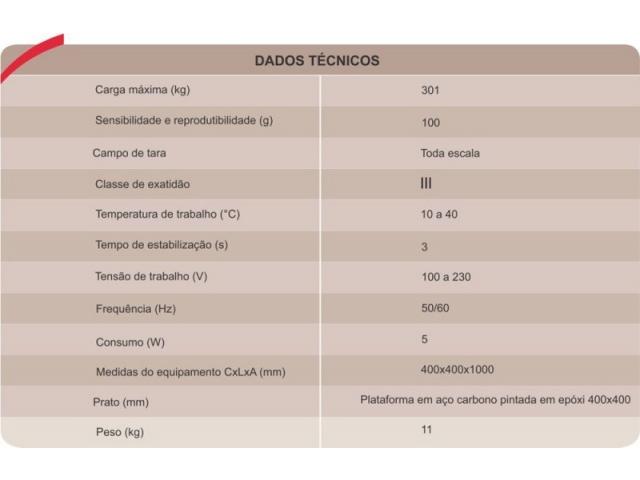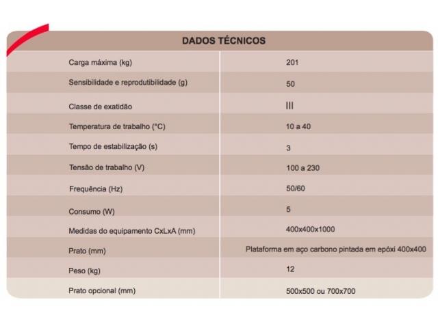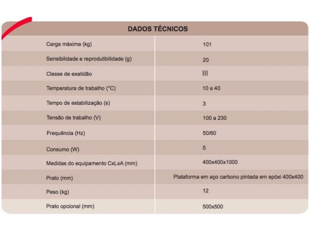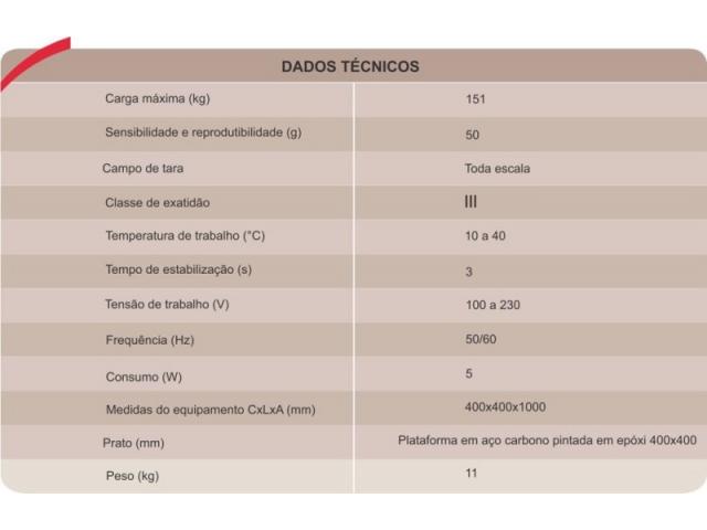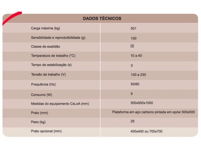 Opcionais: painel de luzes, bateria recarregável com 8 horas de trabalho e 8 horas de recarga, certificado de calibração rastreável RBC, impressora matricial, impressora de impacto, etiquetadora, processador estatístico MF1 para indústrias e farmácias, segundo painel remoto, conversores: RS232 - tcp/ip, RS232 - usb, RS232 - RS485 e RS232 - 4-20ma, módulo de potência para acionamento de válvulas hidráulicas, pneumáticas, motores elétricos e outros e cabo para conexão excel - db25m-db9f com 1,5m de comprimento, estrutura em aço inox (plataforma e coluna), plataforma de 500x500mm, rodas para transporte.